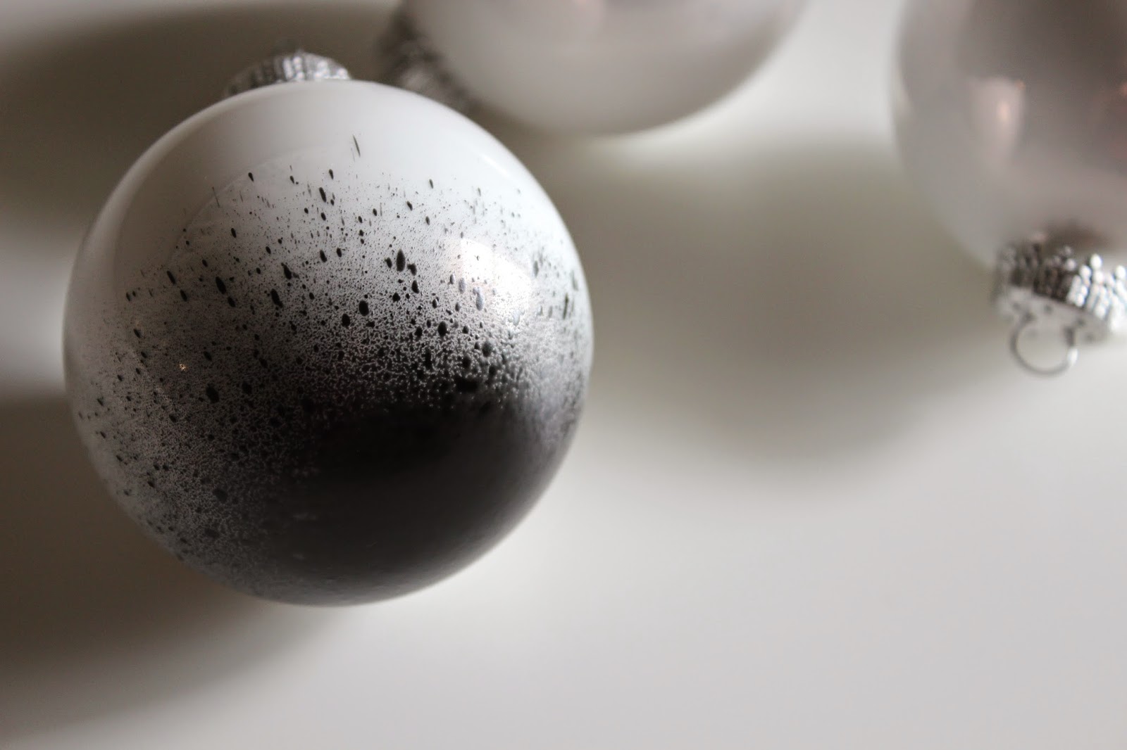 Jason and I had some fun playing with spray-paint the other night. We picked up these white ornaments from Hobby Lobby, and a can of black spray-paint. It was our first time really experimenting with spray-paint, so for first-timers I think they turned out pretty cool! We practiced on a large sheet of paper first to get that ombre effect. It's always fun to try something new.